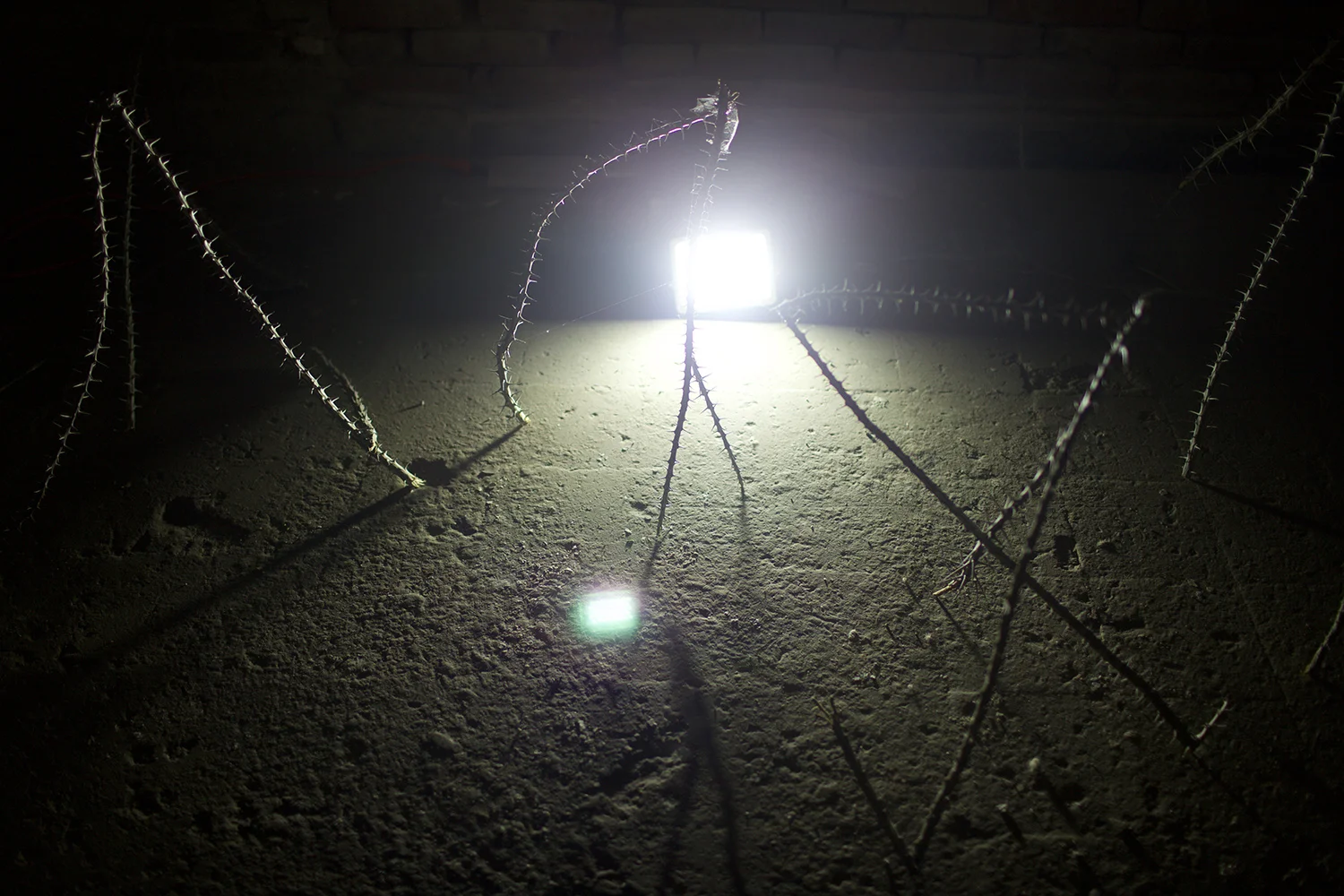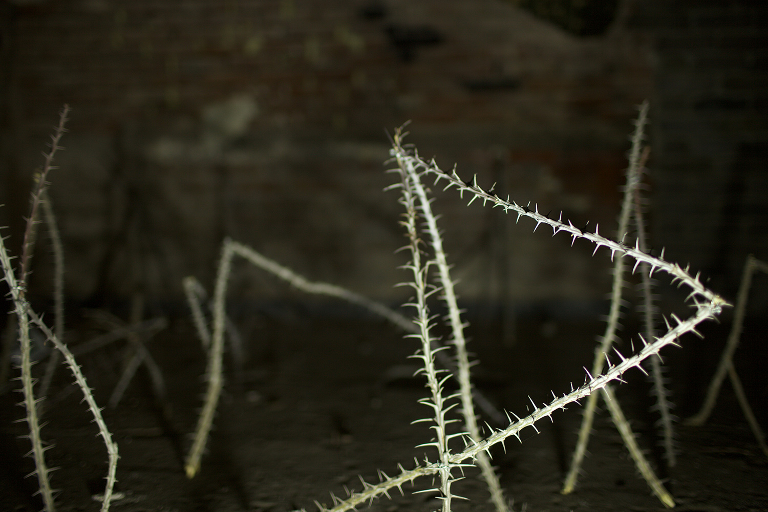 Me interesa la inmersión del espectador en un paisaje de matorrales con altos contrastes luminosos producido por los reflectores distribuidos en el espacio, donde el tiempo de oscuridad es mayor a los pocos segundos de tiempo de luz de cada fuente, y con el fin de generar la sensación de ver la imagen de estos matorrales dibujados en la retina, causado por la estimulación constante de estos cambios de luz. Así, el desplazamiento del material de un campo árido hacia un sitio de exhibición, no solo es físico, también es un fenómeno fisiológico que extiende y traduce la imagen.