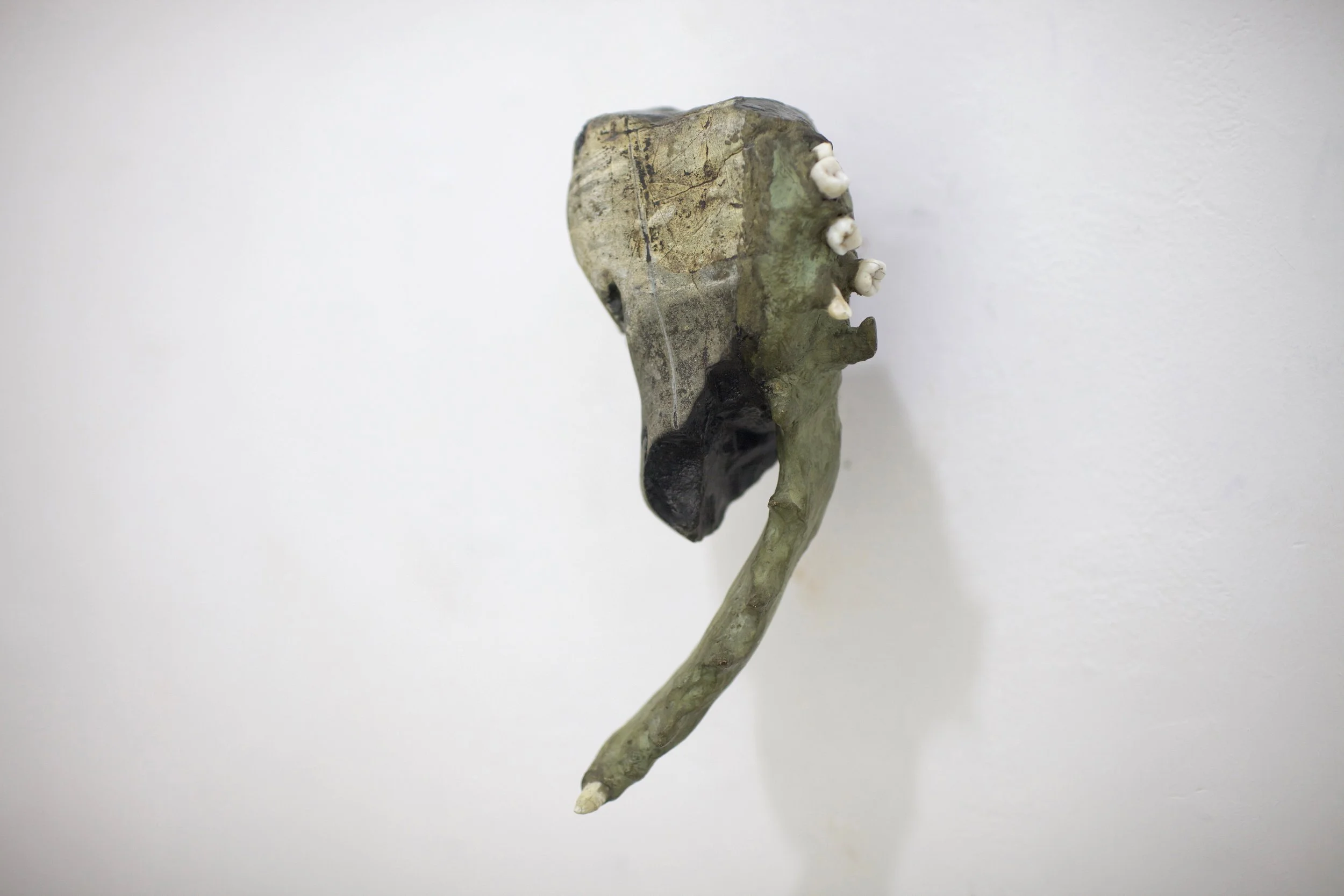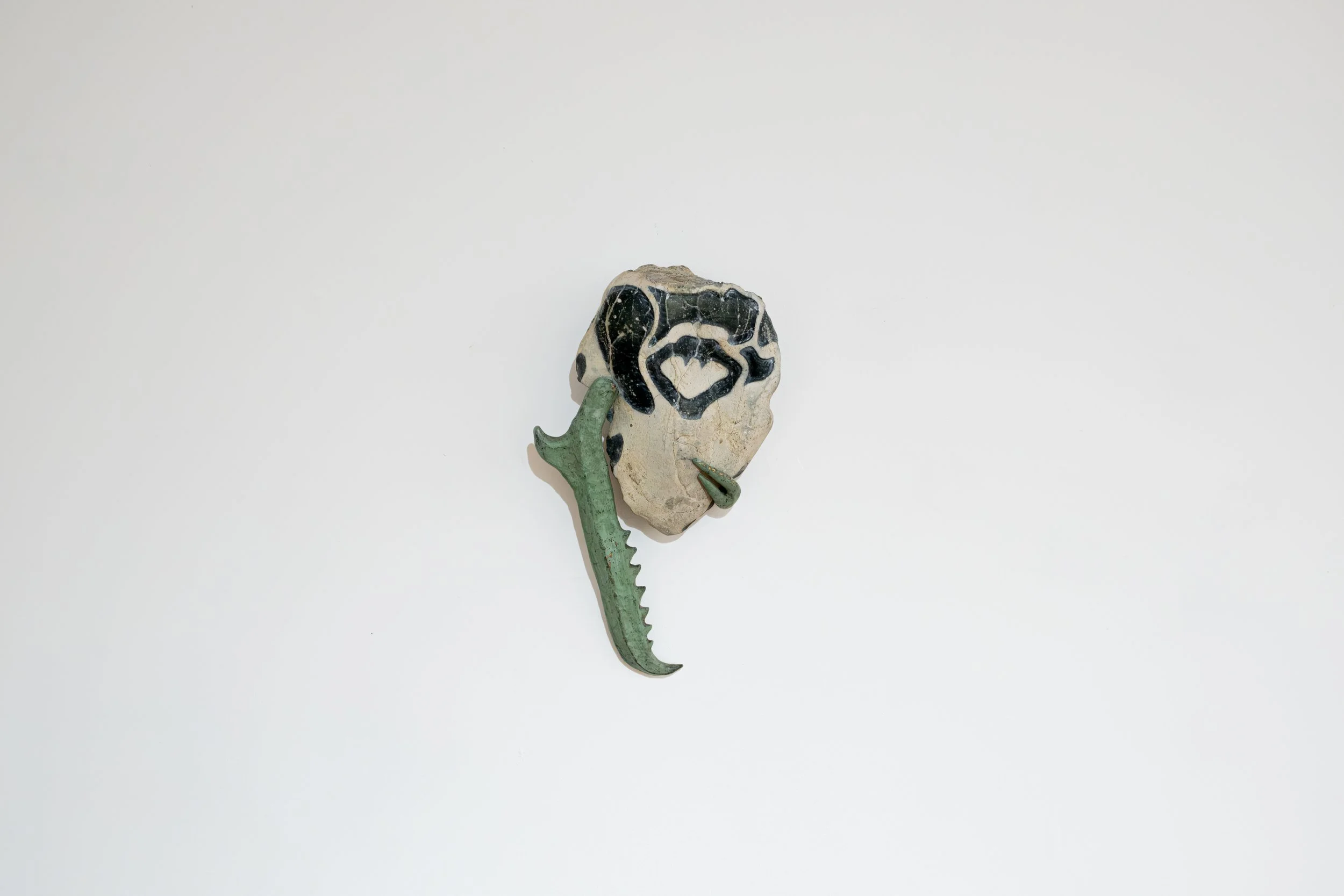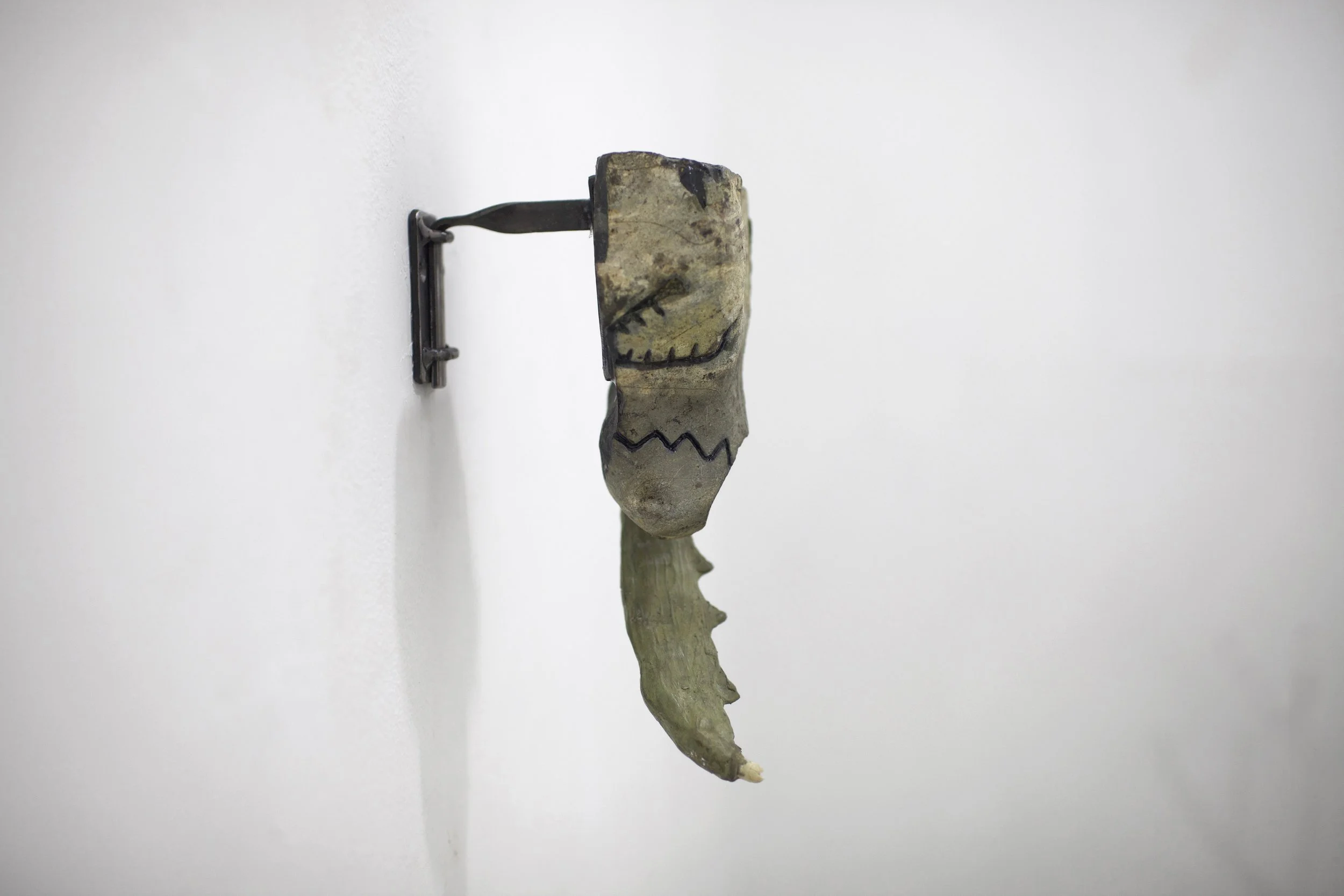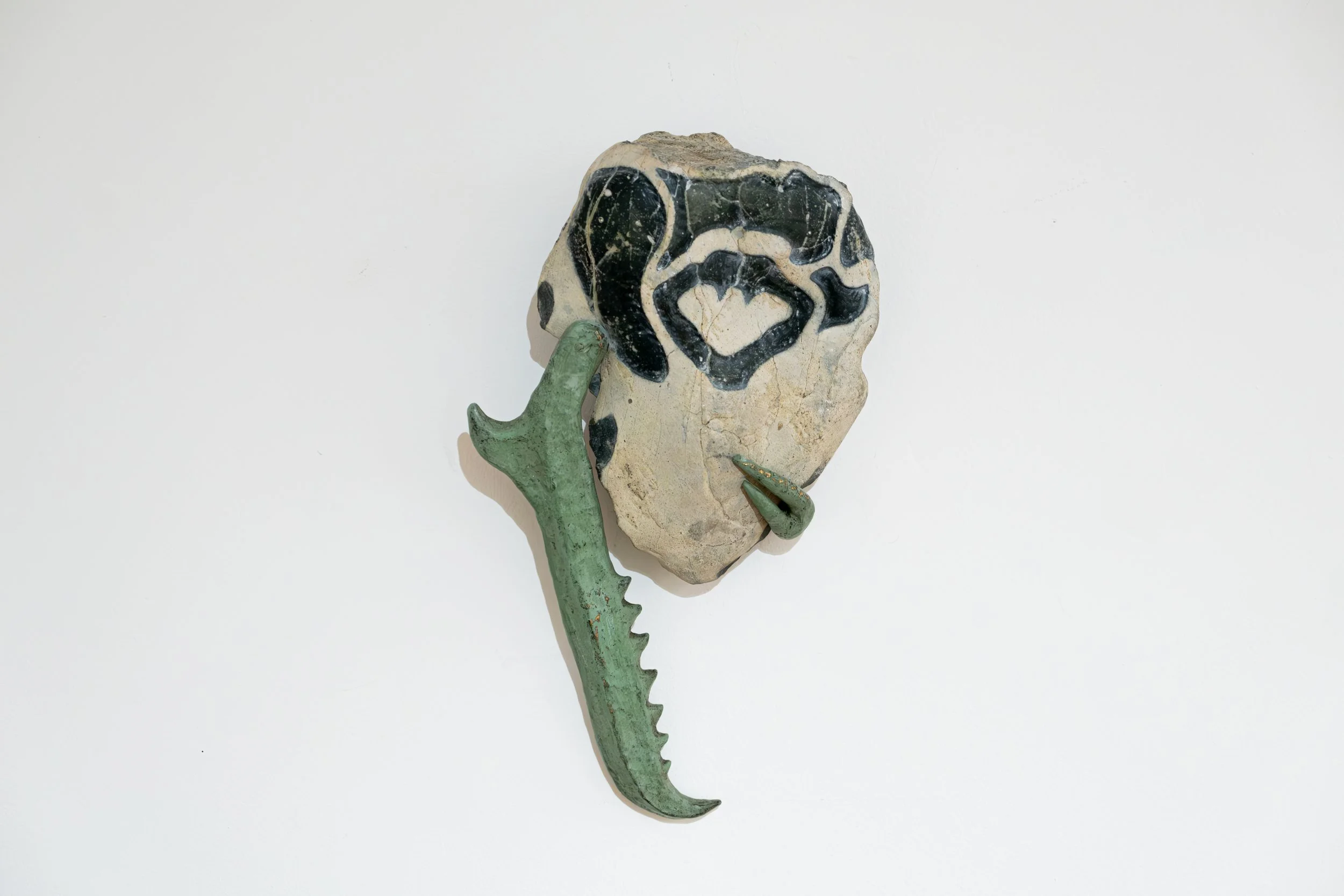 Las piezas de la serie Mandibulares surgen de la unión entre fragmentos minerales y la simulación de elementos orgánicos: patrones animales, marcas y huesos falsos. En ellas, la piedra tallada dialoga con el metal y los restos dentales, evocando vestigios de criaturas improbables o fósiles imaginarios. Algunas incorporan huellas de materiales de construcción, como varillas impresas en lo que parece una mandíbula. Cada escultura conserva las marcas del tiempo y del gesto, como si en su superficie persistiera la memoria de un cuerpo que nunca existió.