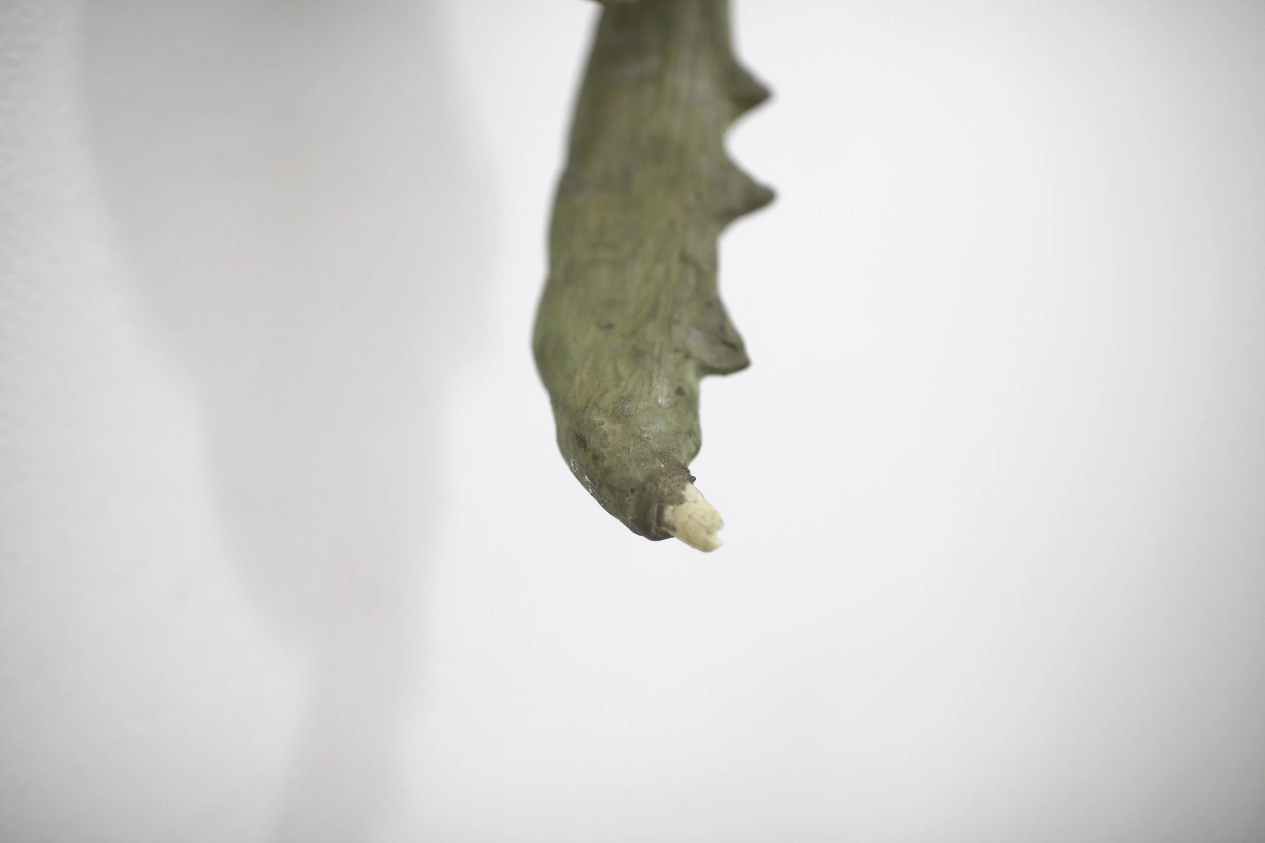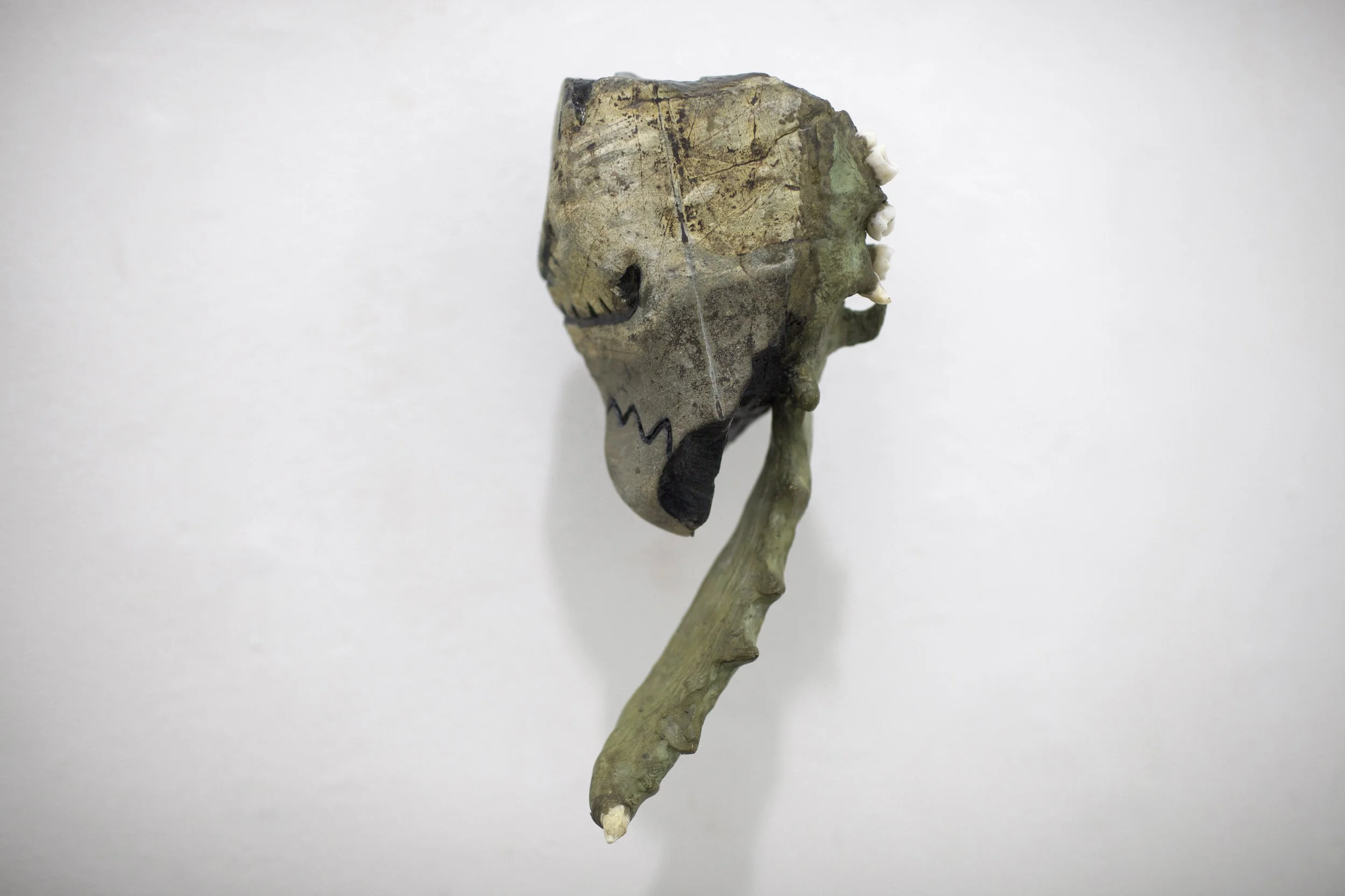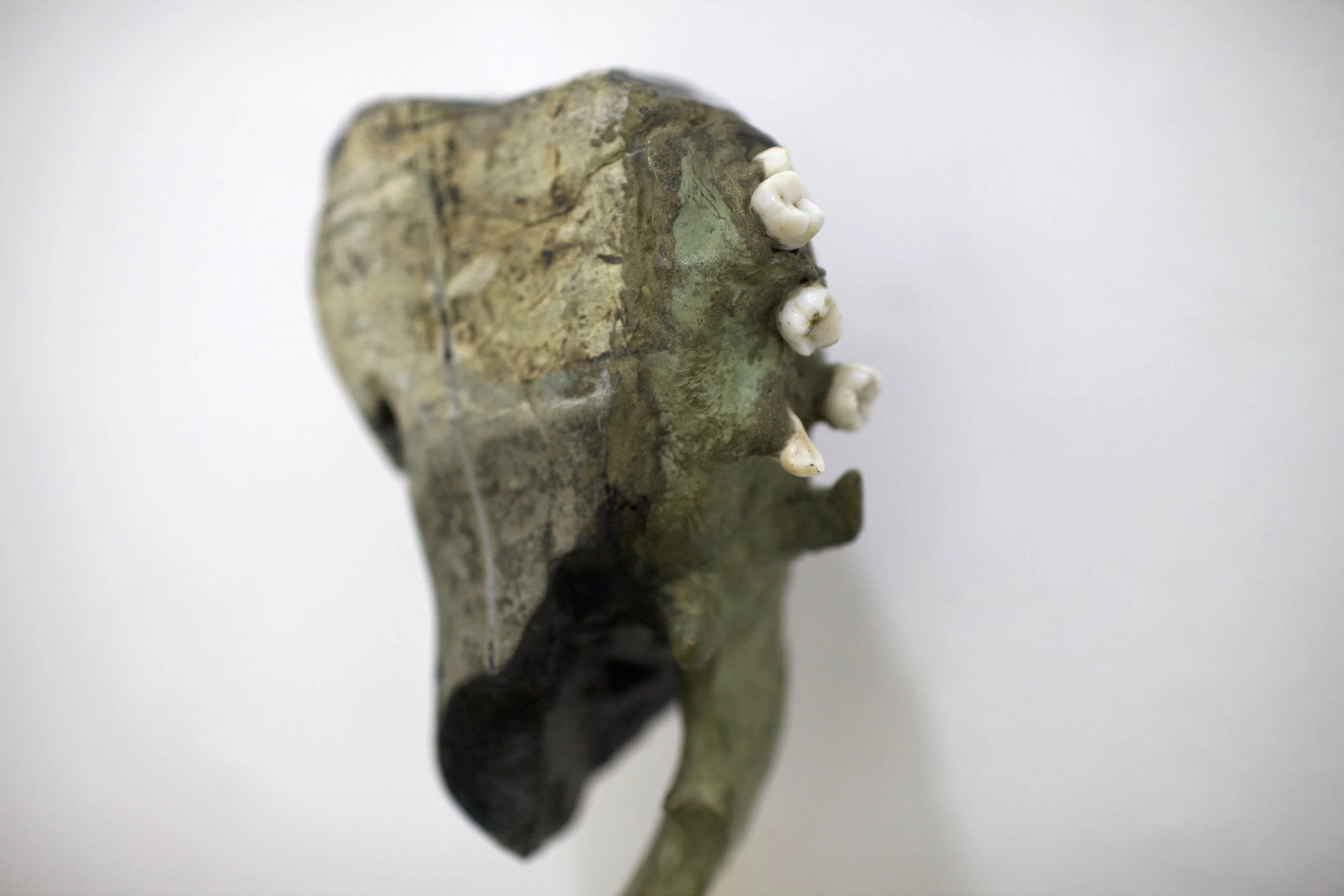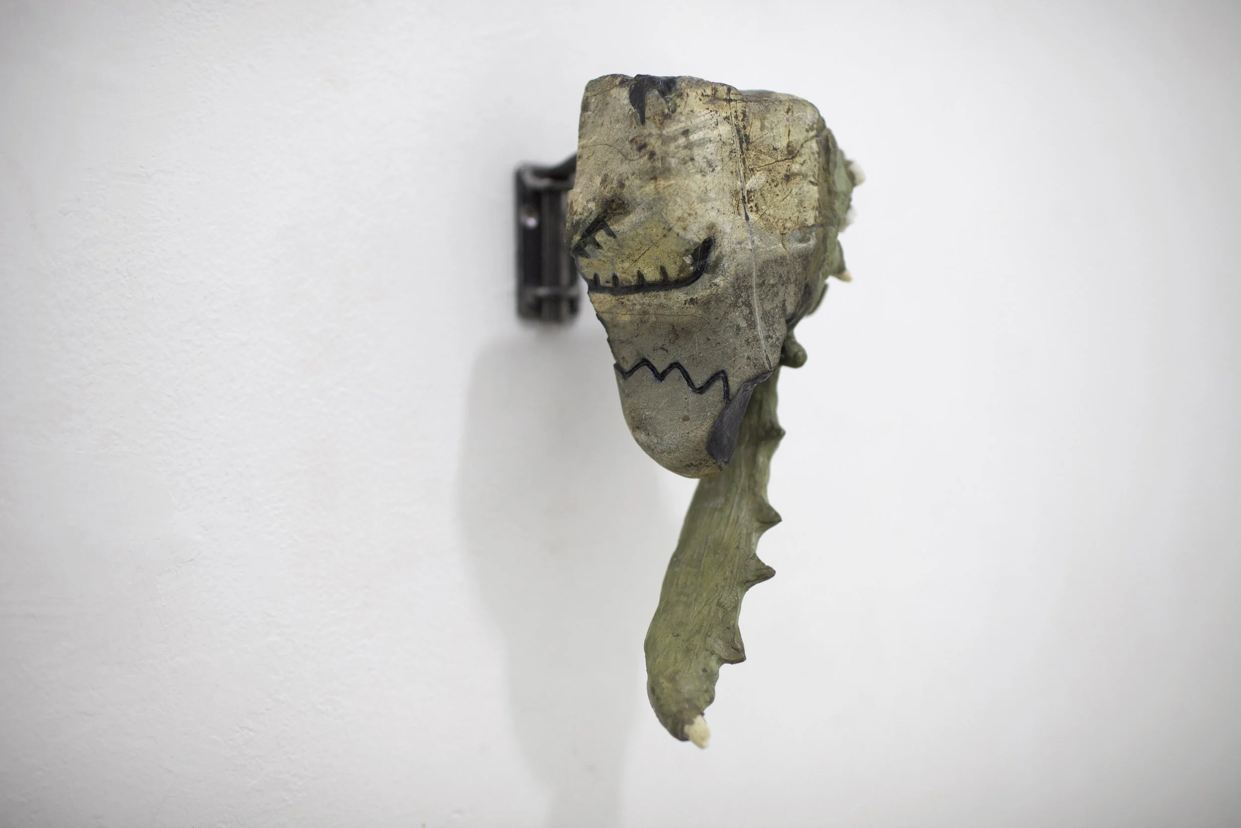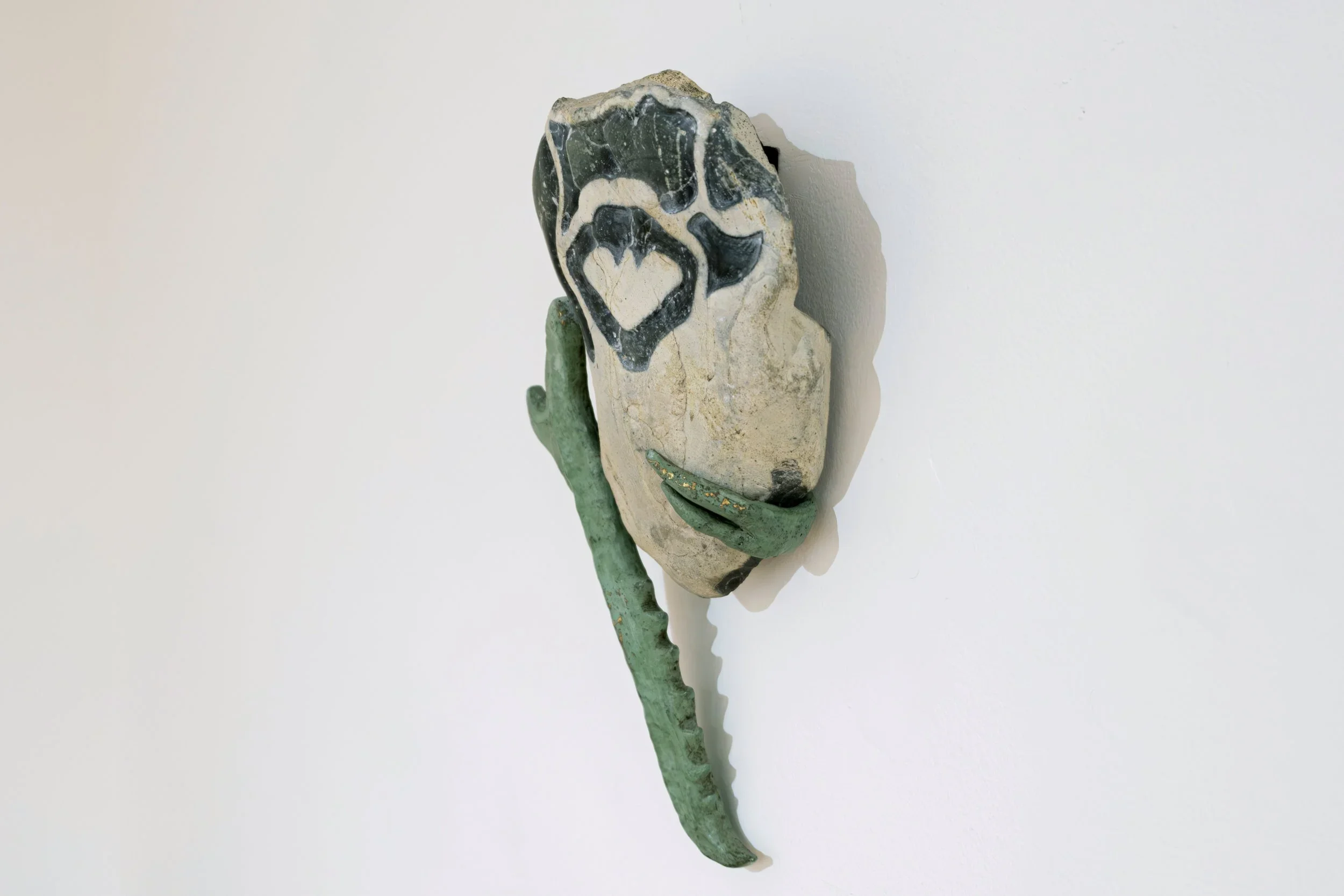 Las piezas de la serie Mandibulares surgen de la unión entre fragmentos minerales y la simulación de elementos orgánicos: patrones animales, marcas y huesos falsos. En ellas, la piedra tallada dialoga con el metal y los restos dentales, evocando vestigios de criaturas improbables o fósiles imaginarios. Algunas incorporan huellas de materiales de construcción, como varillas impresas en lo que parece una mandíbula. Cada escultura conserva las marcas del tiempo y del gesto, como si en su superficie persistiera la memoria de un cuerpo que nunca existió.