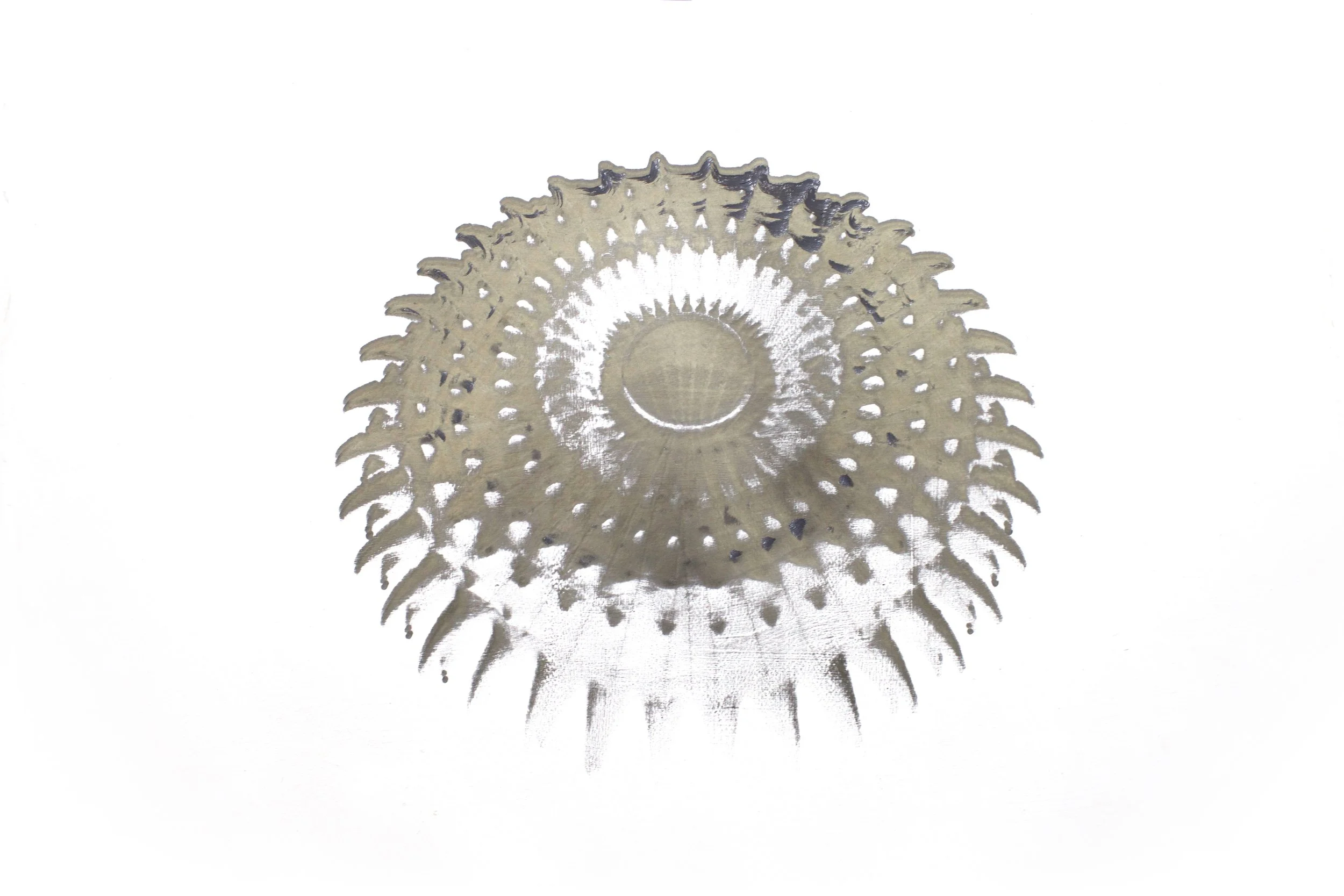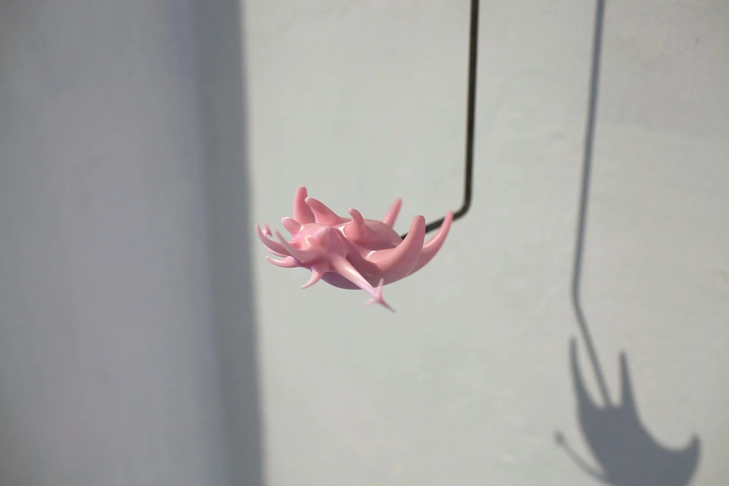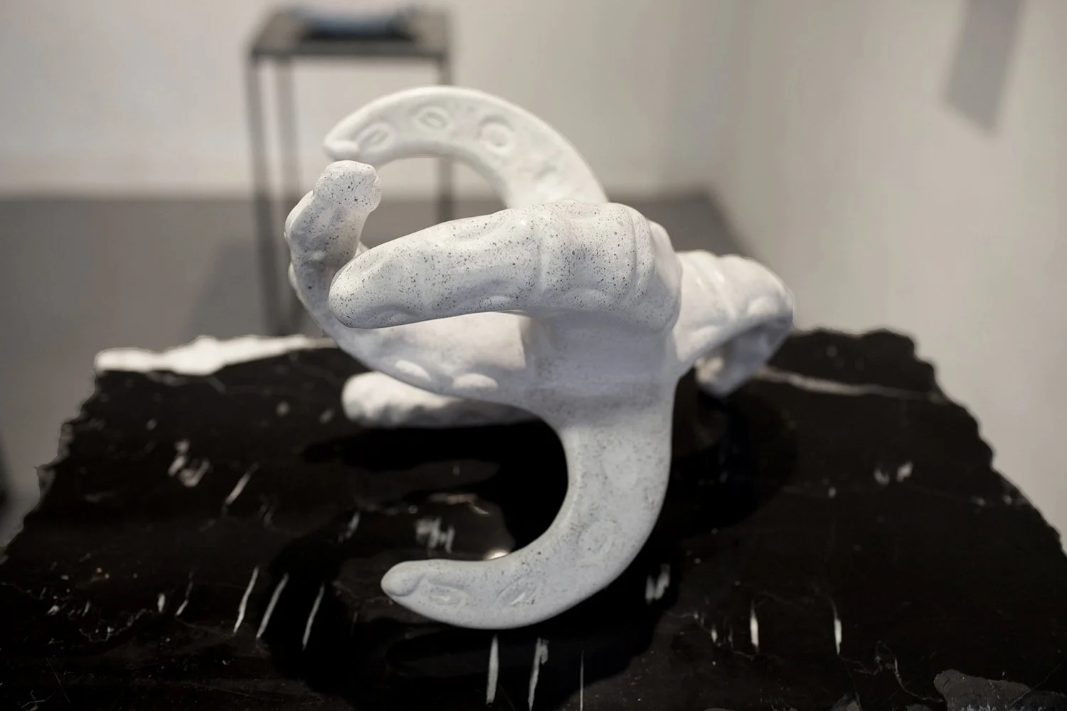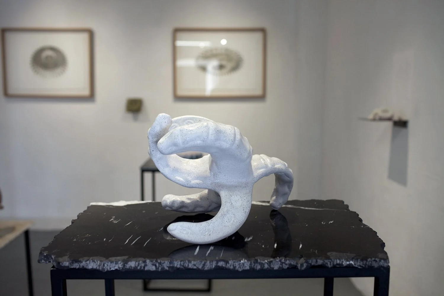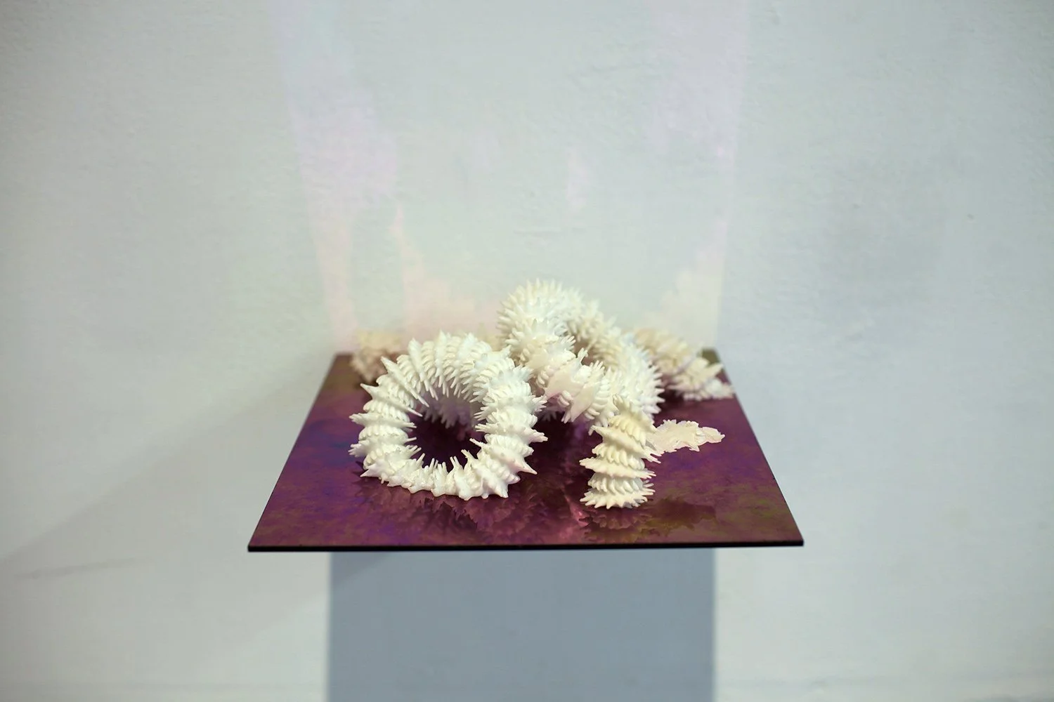 Ocaso primigenio parte del cuerpo de obra fósiles de lo que podría ser o quizás será integrado por video, esculturas y dibujos que derivan de modelos digitales en 3D que surgen de diseños geométricos básicos, que al complejizarlos resultan en un conjunto de criaturas primigenias, organismos ficticios que entrelazan la cultura digital con narrativas de la historia natural.