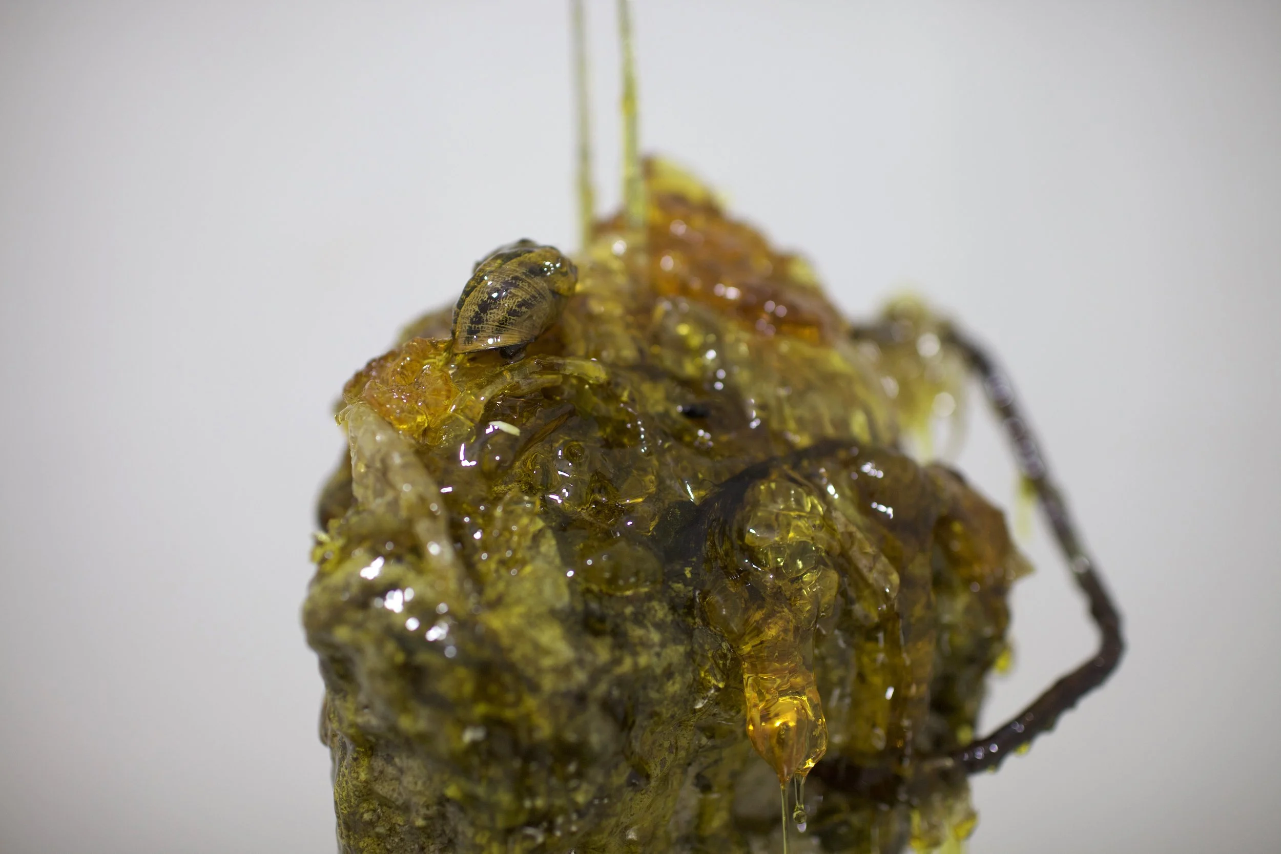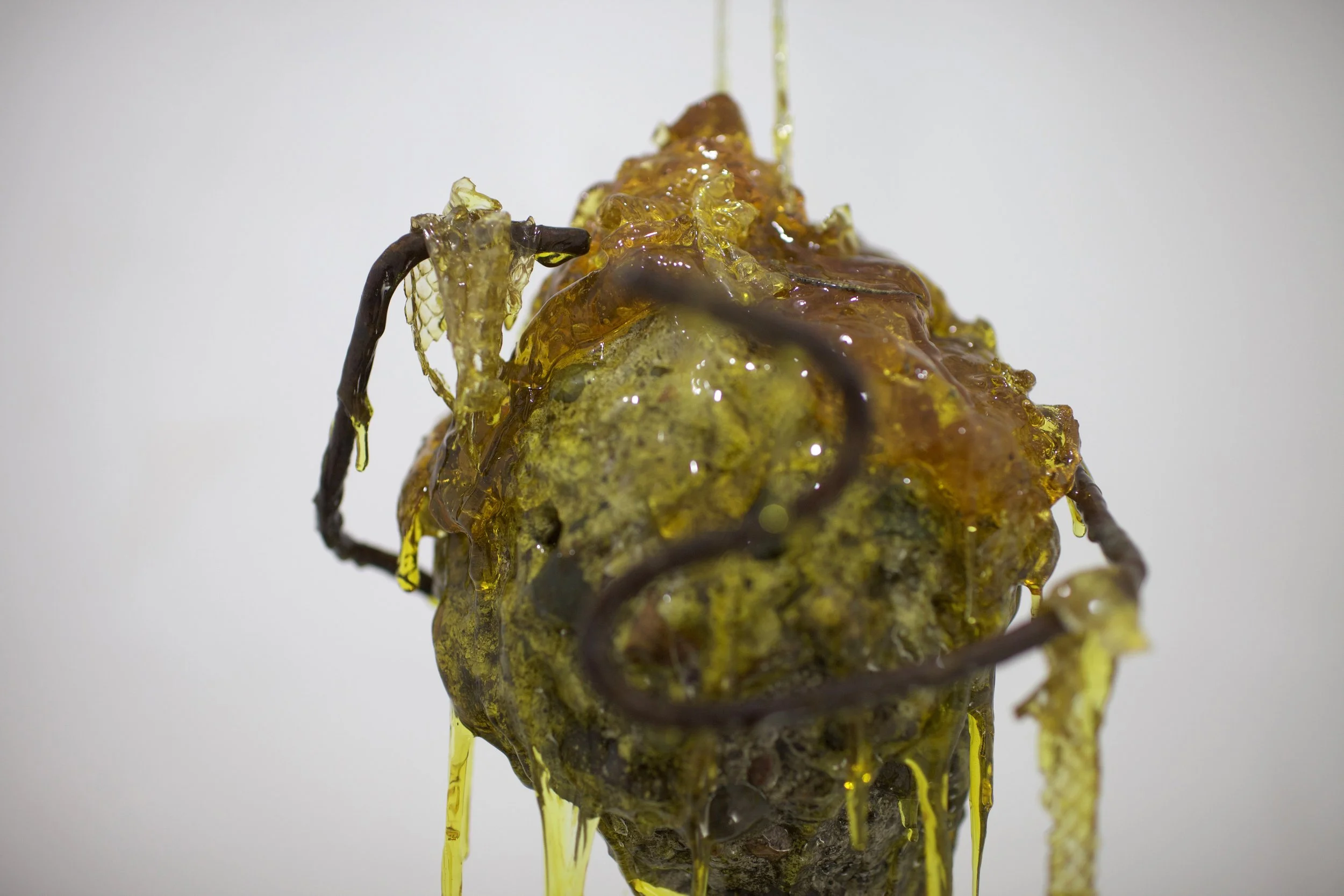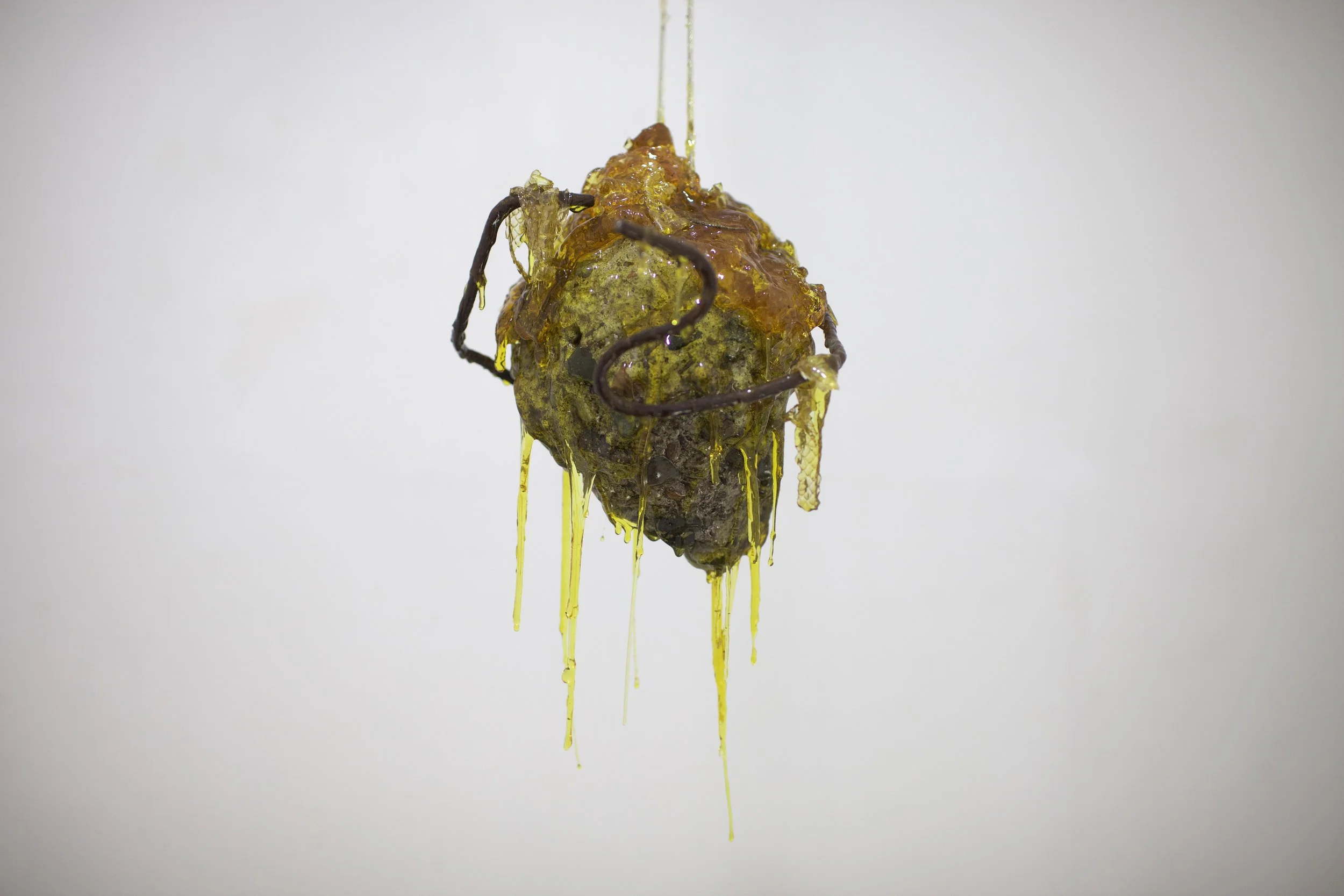 Esta pieza surge a partir de un fragmento de escombro recolectado en los montes de Hermosillo. El material, detrito proveniente de la ciudad y arrojado al entorno natural, se encuentra encapsulado en resina sintética junto con restos orgánicos como insectos, caracoles, una cola de lagartija y mudas de serpiente. La resina actúa como una membrana que conserva y suspende estos elementos en un estado intermedio entre la descomposición y la permanencia. La escultura propone una reflexión sobre los ciclos de “vida”, donde la fugacidad de lo orgánico y la ruina se entrelazan y se transforman mutuamente.
