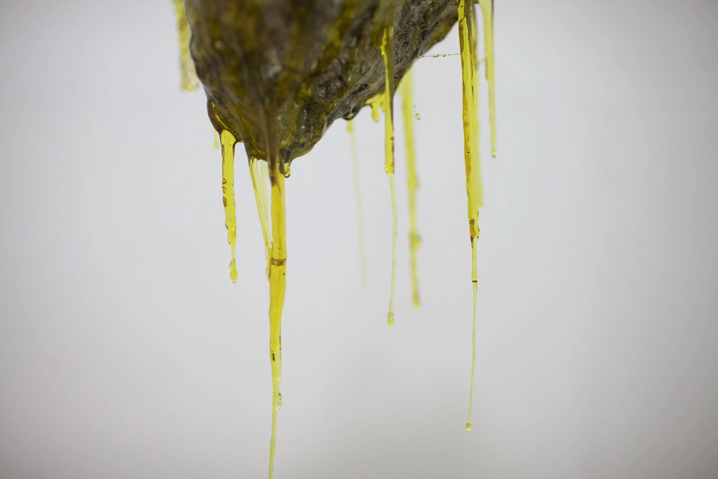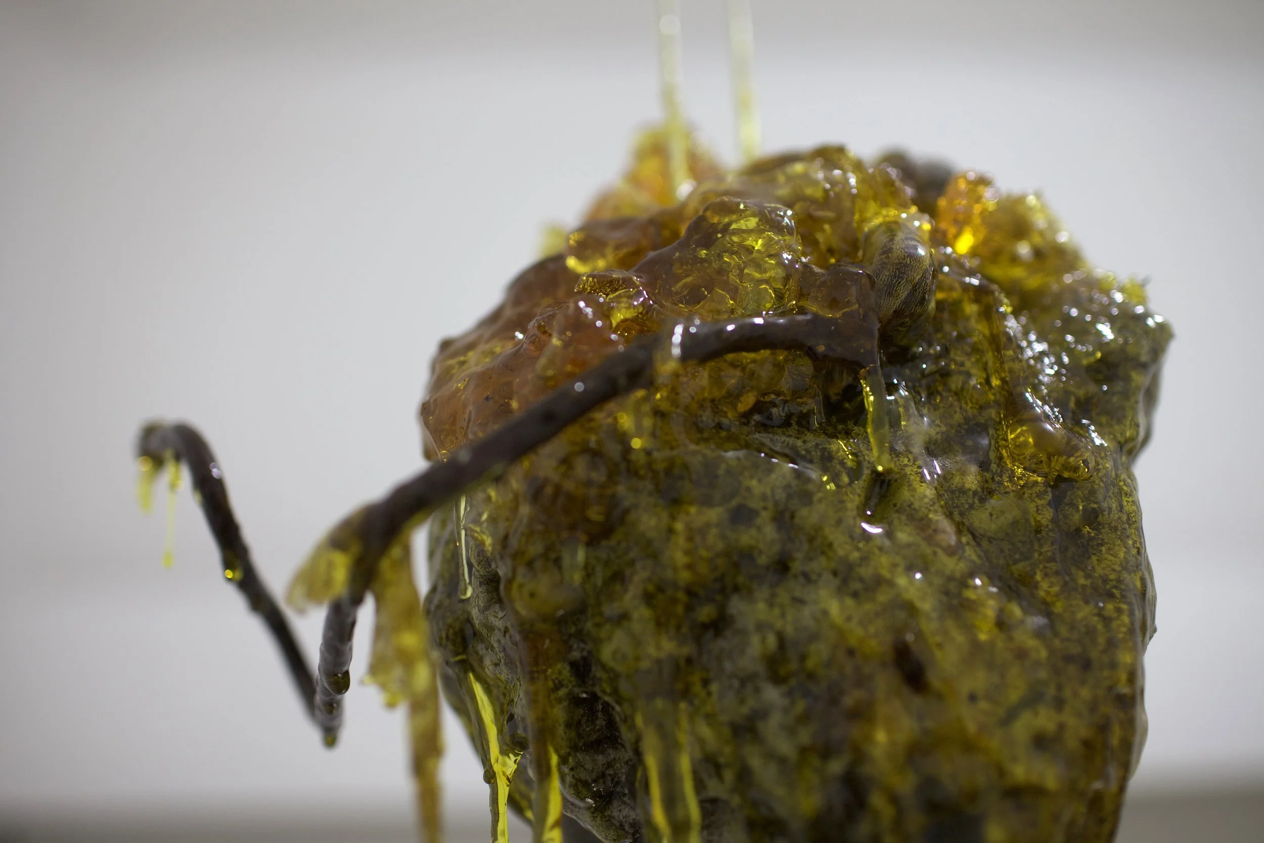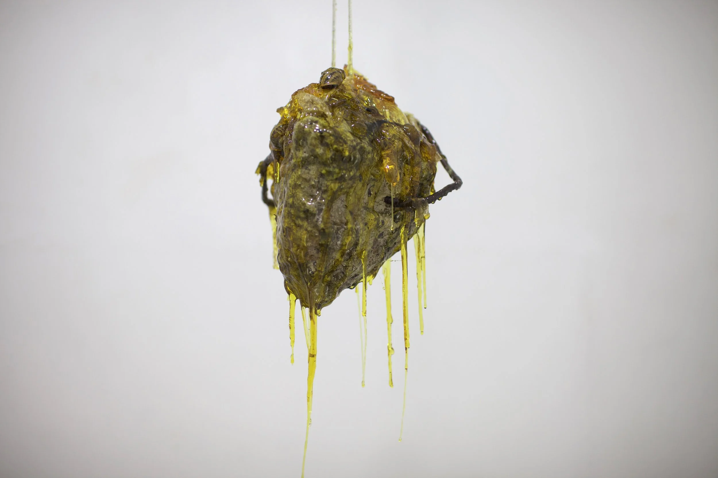 Esta pieza surge a partir de un fragmento de escombro recolectado en los montes de Hermosillo. El material, detrito proveniente de la ciudad y arrojado al entorno natural, se encuentra encapsulado en resina sintética junto con restos orgánicos como insectos, caracoles, una cola de lagartija y mudas de serpiente. La resina actúa como una membrana que conserva y suspende estos elementos en un estado intermedio entre la descomposición y la permanencia. La escultura propone una reflexión sobre los ciclos de “vida”, donde la fugacidad de lo orgánico y la ruina se entrelazan y se transforman mutuamente.