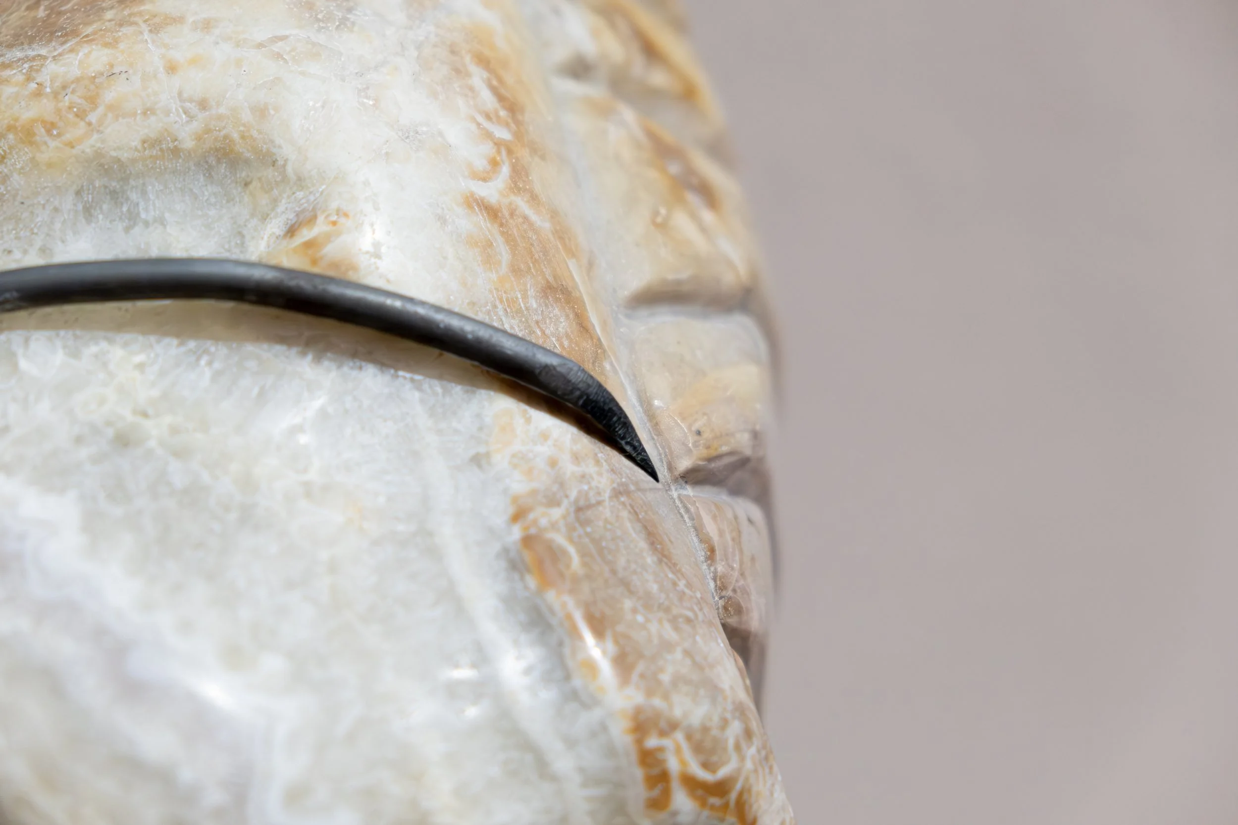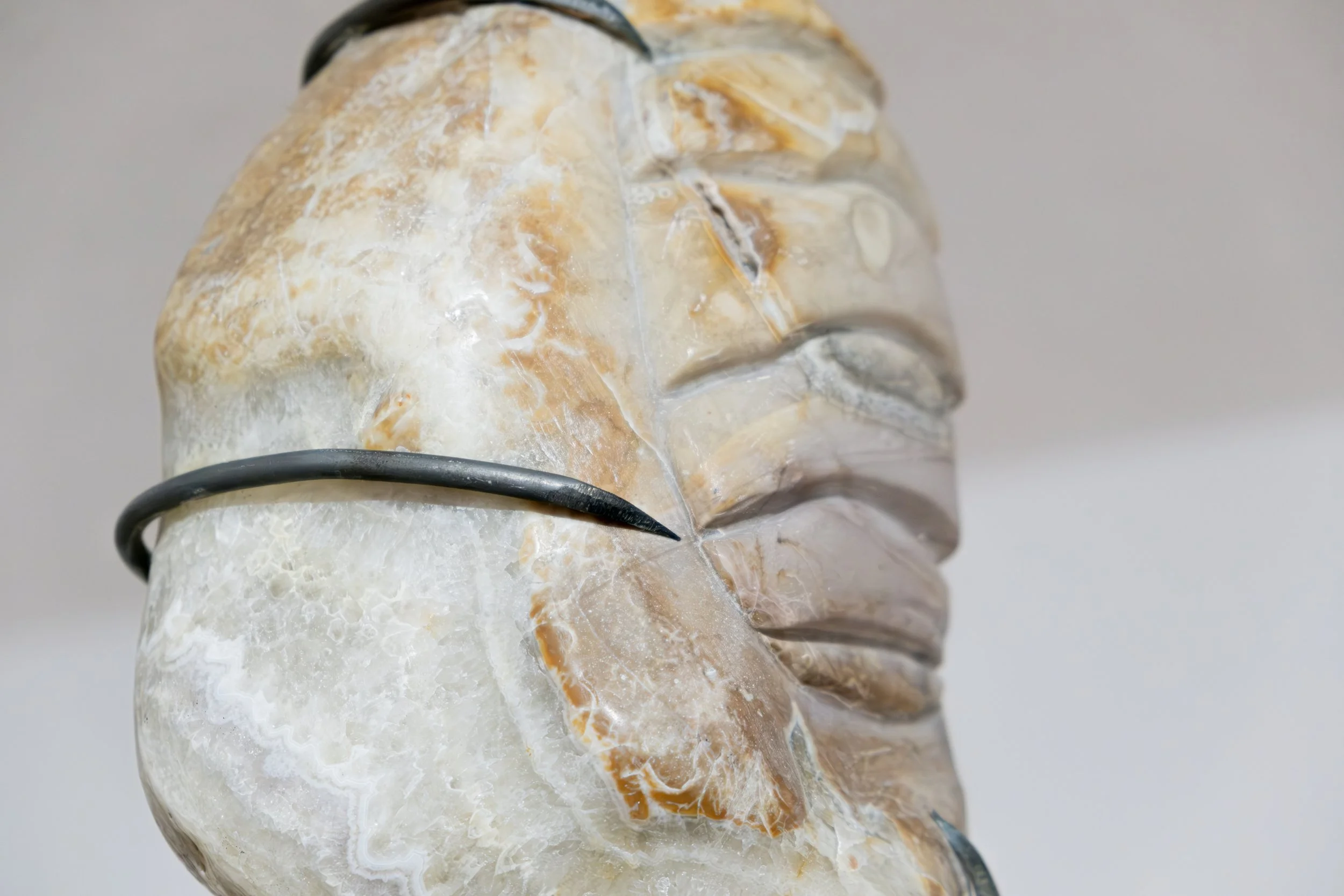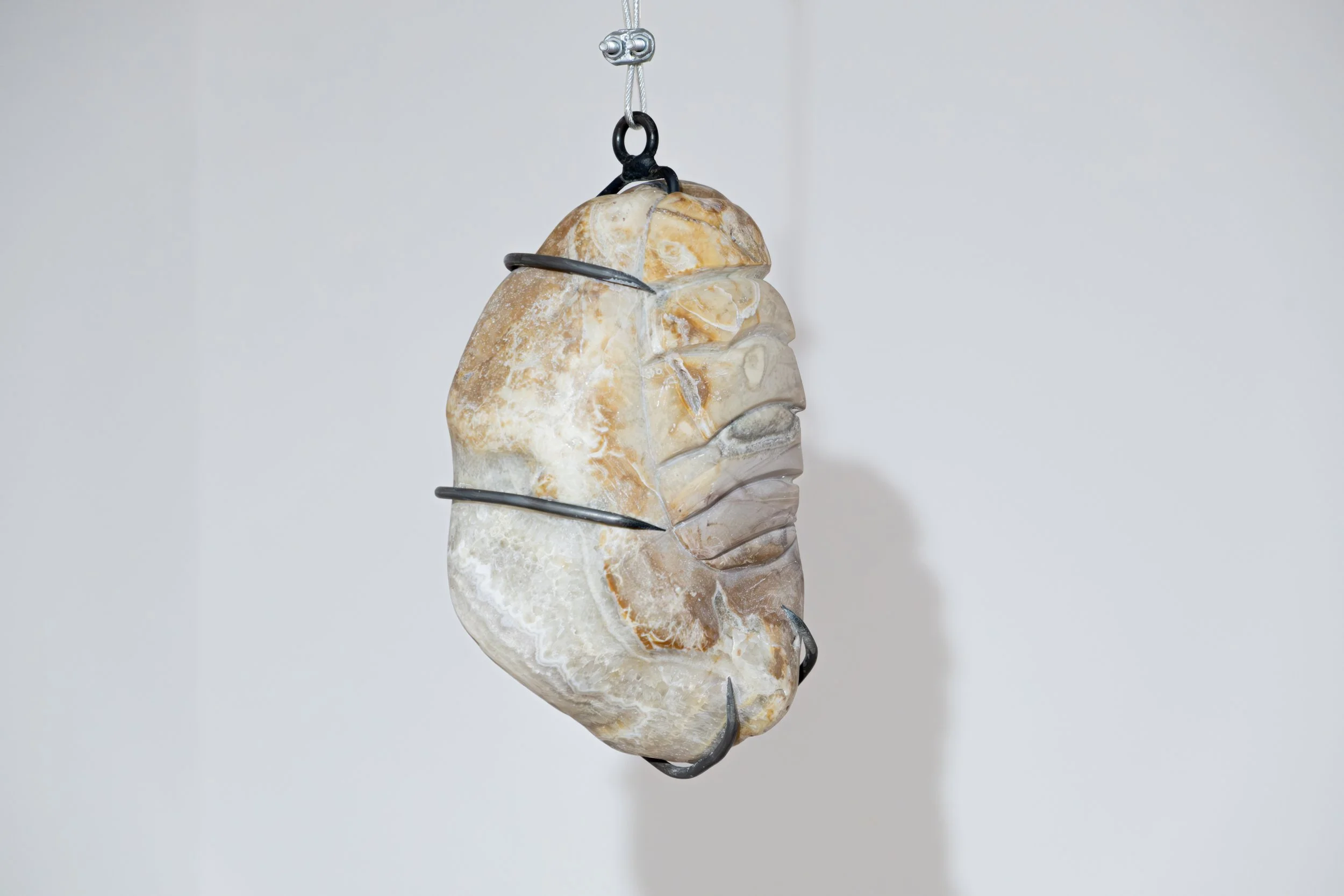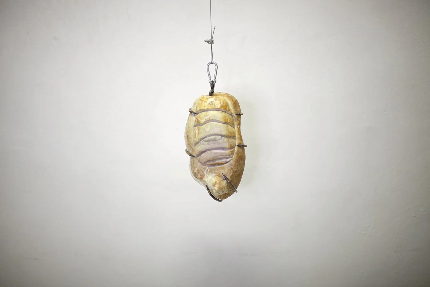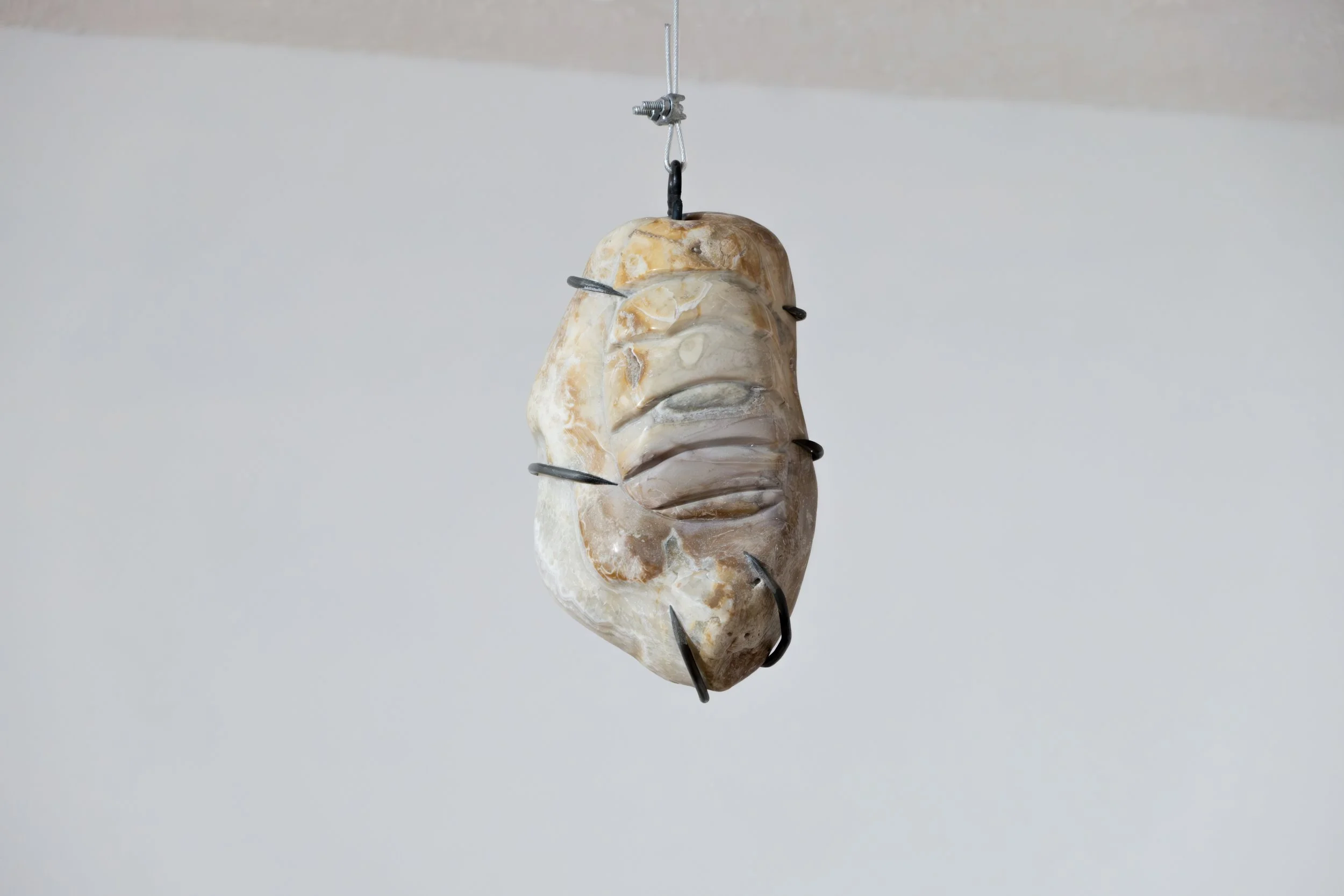 talla directa sobre piedra de río, metal y cable de acero
